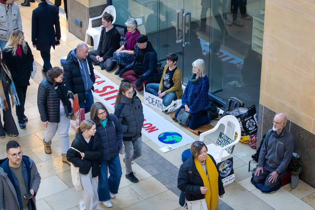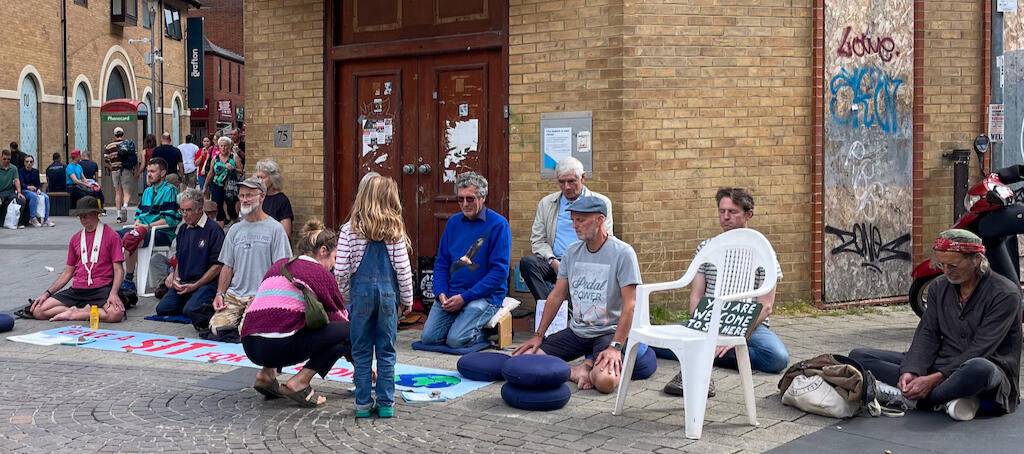 We are sitting because we are in a climate and ecological crisis.People, other species and habitats are being lost now and we want to keep ourselves and others in touch with this. We recognise this is interlinked with other crises, for example global inequality and war, and so at times we support other actions.